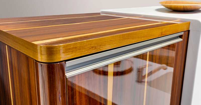 Die Fronten des Modells sind durch Palisander- oder Satin Nussbaum furniert, einer erstaunlichen Kombination aus natürlicher Oberflächenbeschaffenheit und High-Tech.
