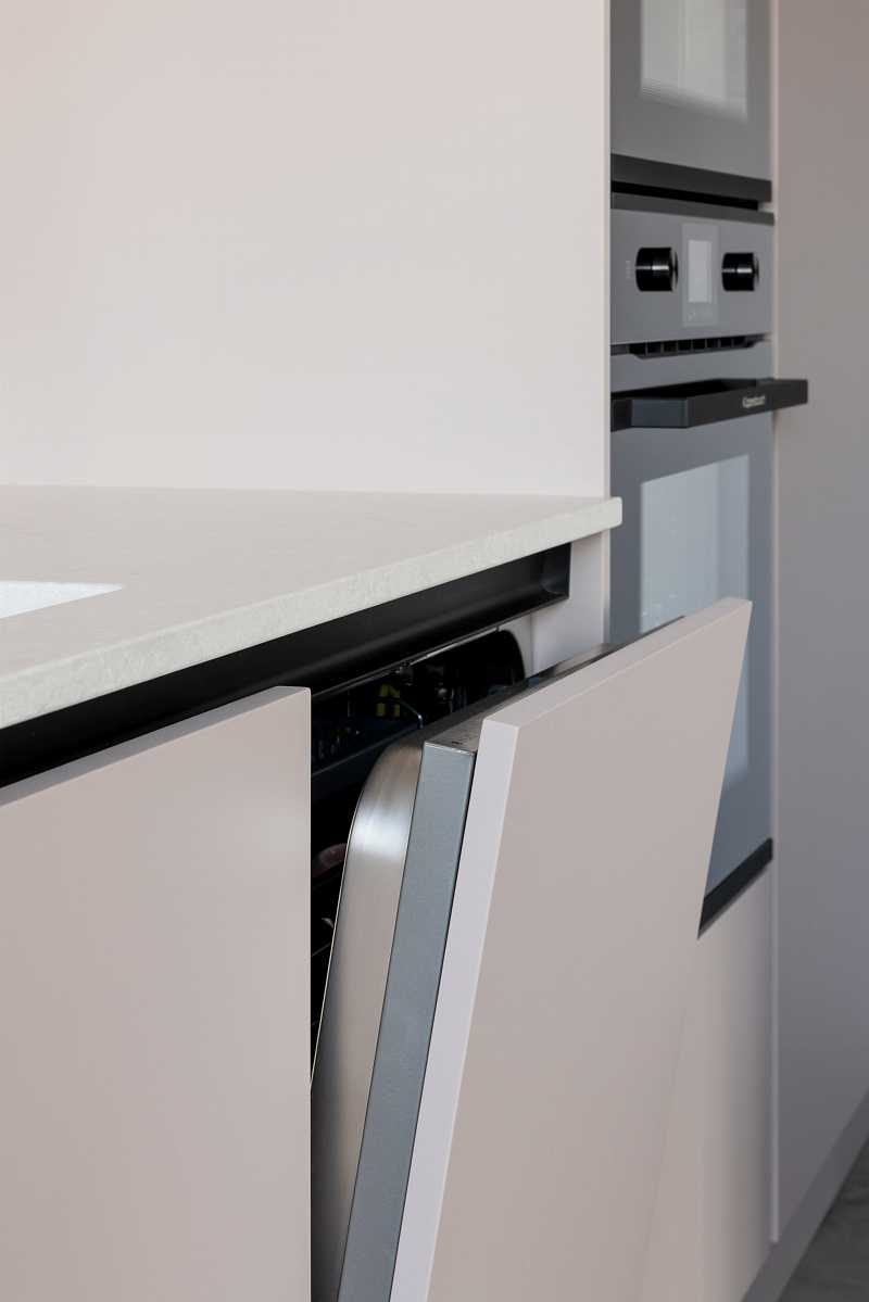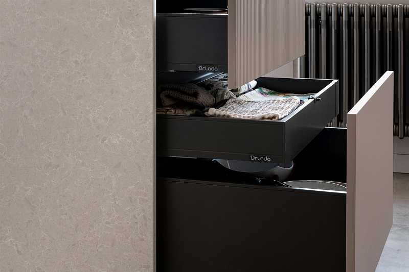 Eine Vielfalt an Materialien für Verzierung, Innovationen und attraktives Design des Modells LINEA. Matte und in der Berührung unglaublich sanfte Fronten. Kann ohne traditionell aufgesetzte Griffe mit ergonomischen versteckten Griffen versehen werden, was jeder schätzen wird, der viel Zeit in der Küche verbringt.