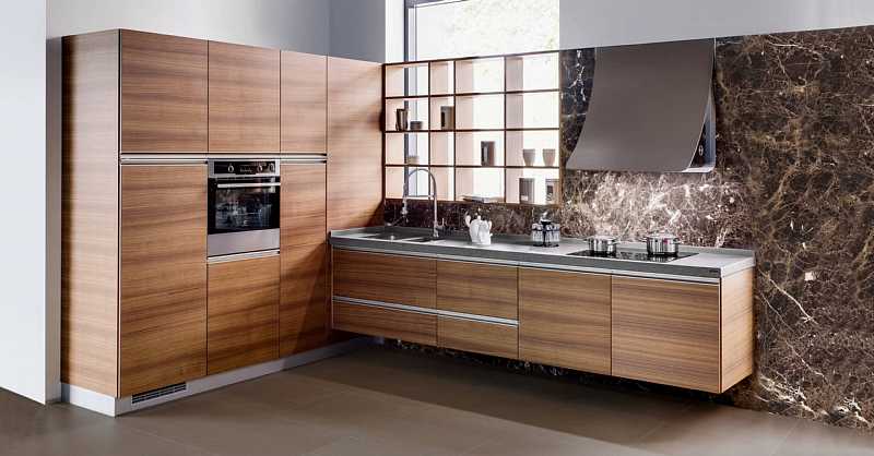 Das weiche Grafikdesign des Modells entfaltet sich im Material der Fronten. Sie können in einem noblen Teakholz- oder Nussbaumfurnier ausgeführt werden. Die natürliche Farbe und das Holzmuster unter Klarlack wird ein echtes Geschenk für die Kenner der natürlichen Schönheit sein, und die abgerundeten Formen der Module tauchen uns ein in die Schiffsthematik und spielen auf die gemütliche romantische Atmosphäre der fernen Wanderungen an.