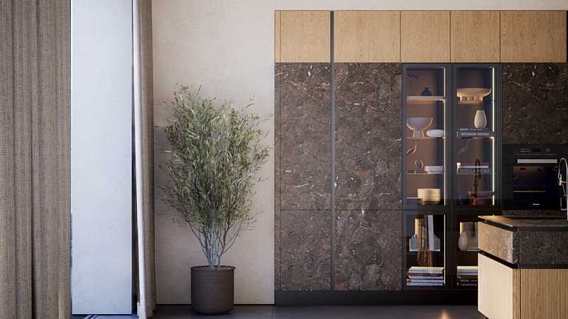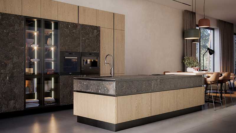 Das zweite Material dieser Küchenanordnung - Keramik sieht gut aus mit natürlichem Eichenholz. Die mit Keramik bedeckten Inseln, die hohen Schränke und die Arbeitsplatte unterstreichen das luxuriöse, raffinierte Aussehen der Küche.