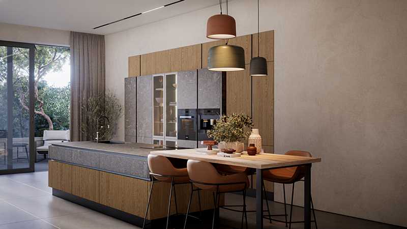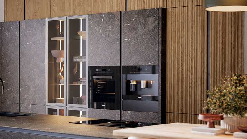 Die dicke Anwendung des Furniers mit vertikalem Fräsen verleiht der Küche ein einzigartiges Aussehen. Die vertikale Struktur der Fassaden erzeugt ein lebhaftes, nach oben gerichtetes Bild, das an die geraden säulenförmigen Baumstämme eines Regenwaldes erinnert - ein Selva, der das neue Küchenmodell genannt hat.